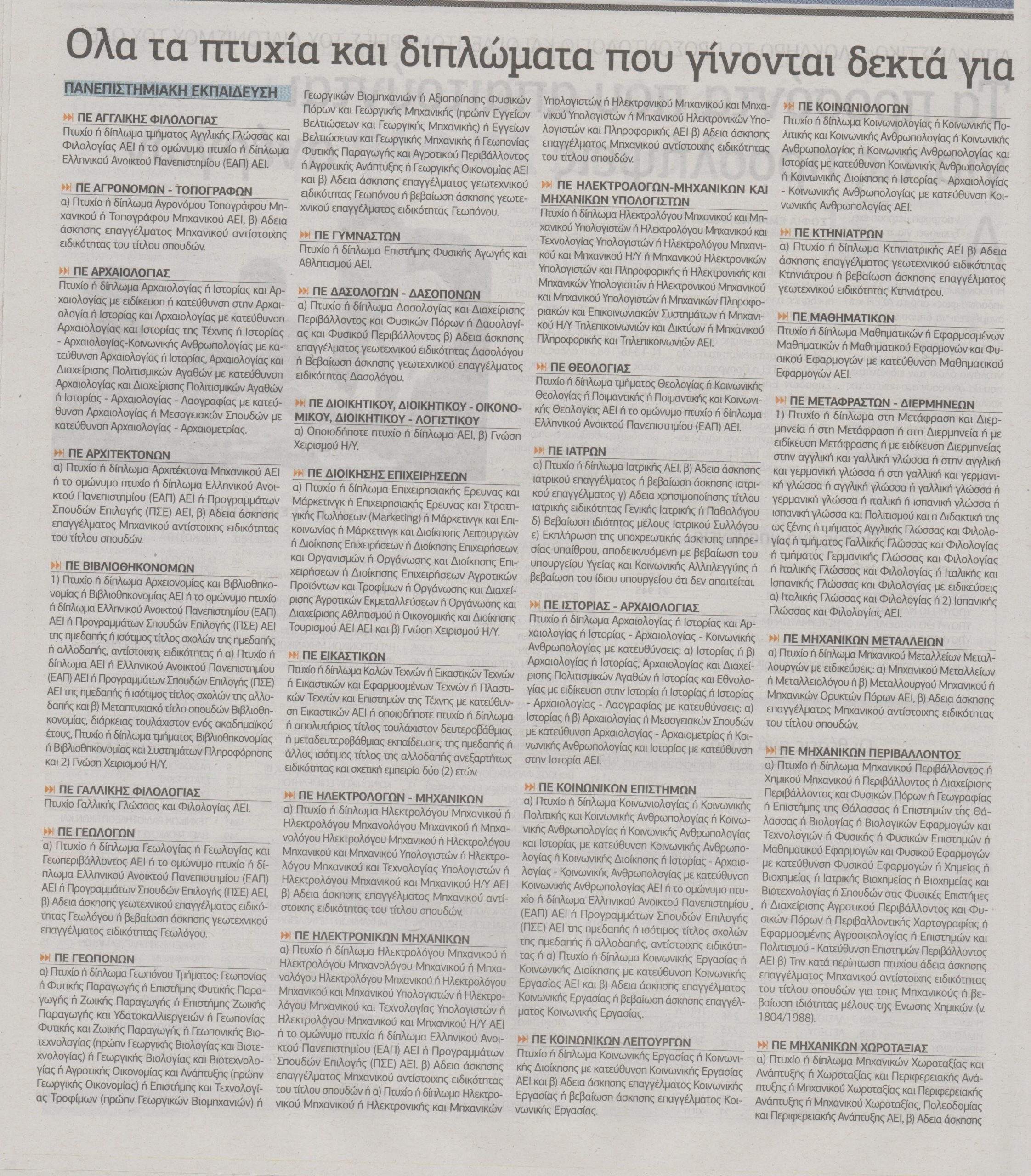 Πρέπει να σημειωθεί ότι, εκτός από τα πτυχία, που αναγράφονται πιο κάτω για τις θέσεις πανεπιστημιακής εκπαίδευσης, γίνονται δεκτά και το ομώνυμο πτυχίο ή δίπλωμα Ελληνικού Ανοικτού Πανεπιστημίου (ΕΑΠ) ΑΕΙ ή προγραμμάτων σπουδών επιλογής (ΠΣΕ) ΑΕΙ της ημεδαπής ή ισότιμος τίτλος σχολών της ημεδαπής ή αλλοδαπής, αντίστοιχης ειδικότητας.