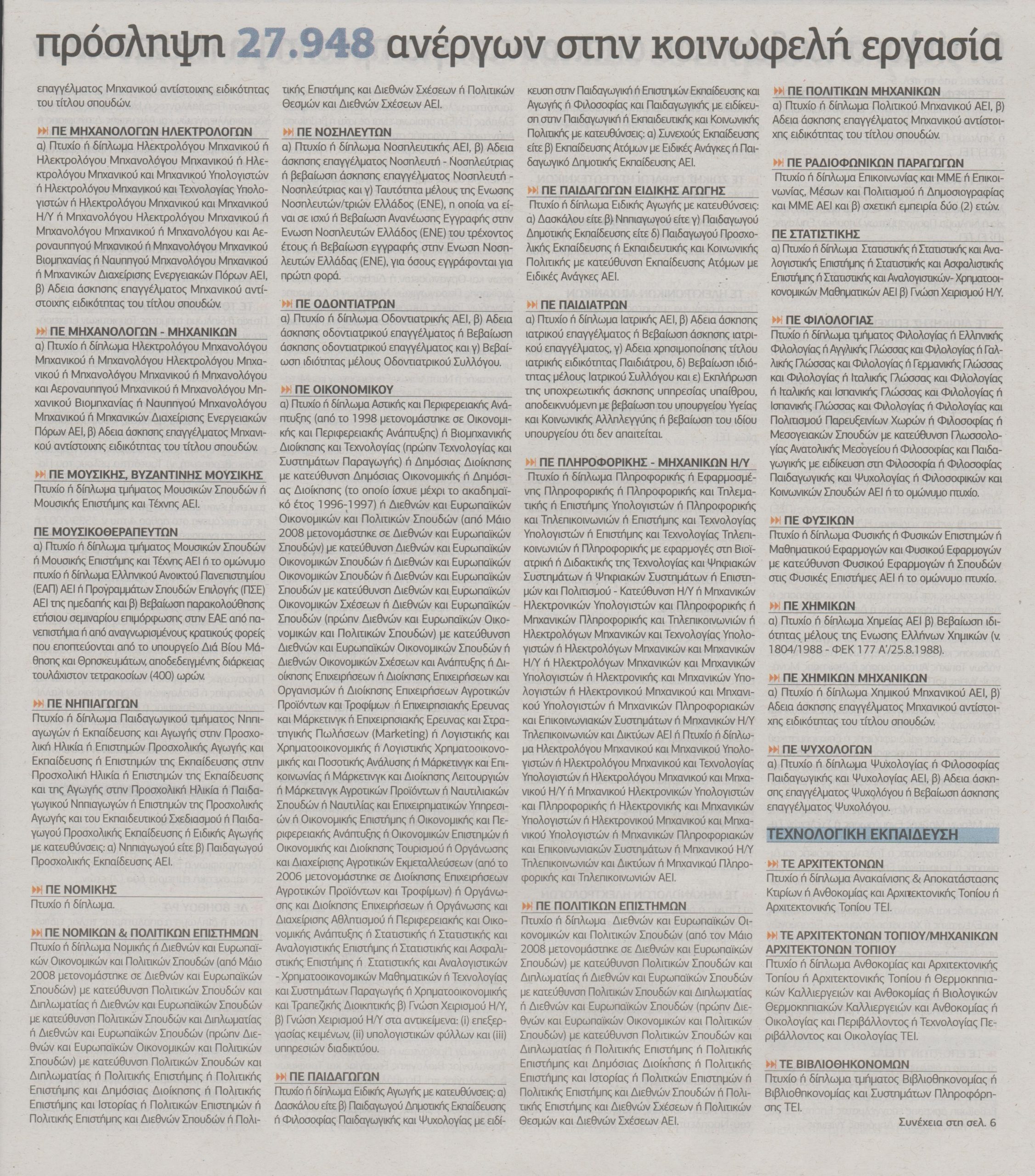 Aναλυτικά τα προσόντα για τις προσλήψεις 27.948 ανέργων