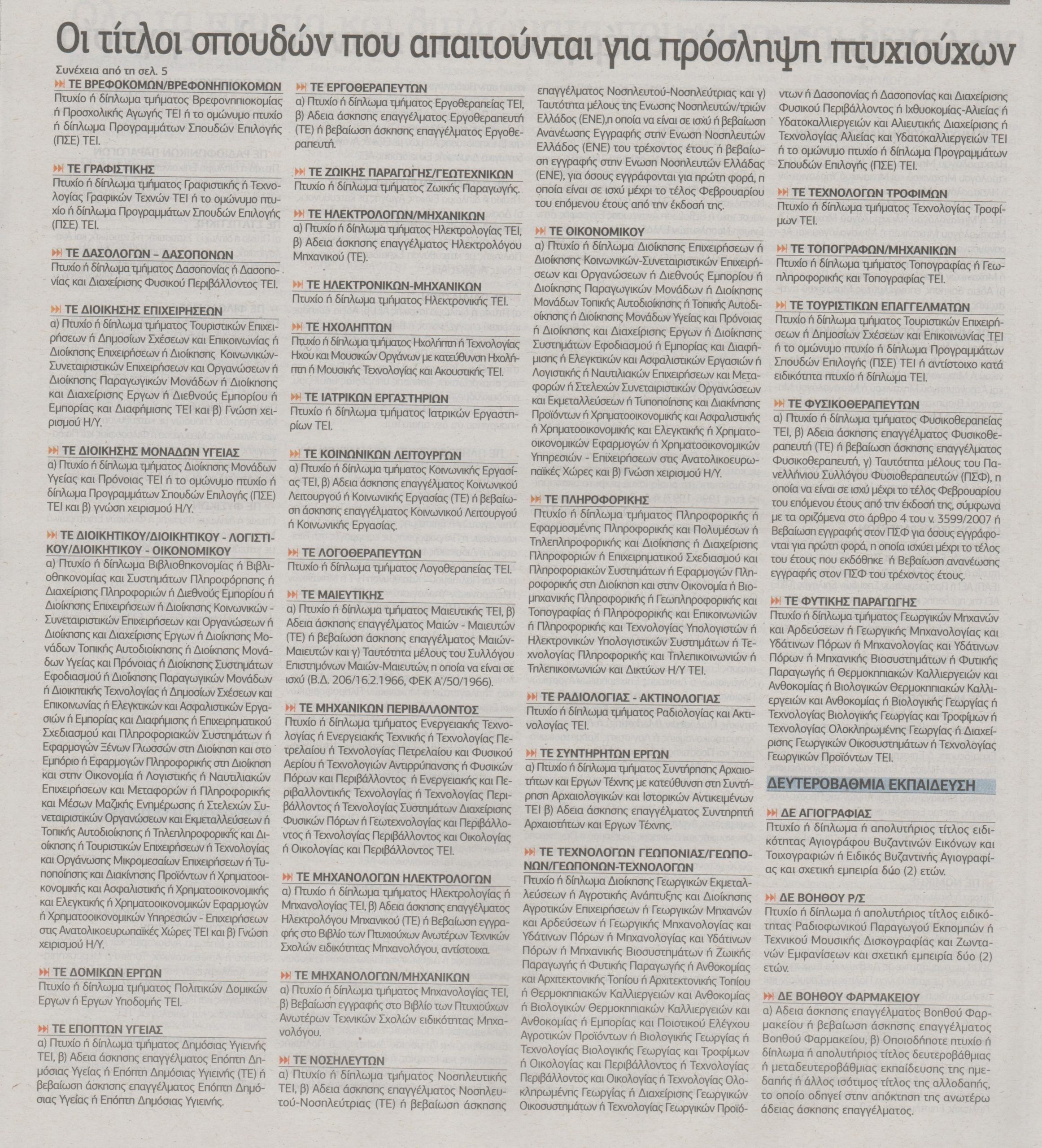Για τις θέσεις ΤΕ γίνονται, επίσης, δεκτά το αντίστοιχο κατά ειδικότητα πτυχίο ή δίπλωμα ΤΕΙ ή προγραμμάτων σπουδών επιλογής (ΠΣΕ) ΤΕΙ της ημεδαπής ή ισότιμος τίτλος σχολών της ημεδαπής ή αλλοδαπής, αντίστοιχης ειδικότητας ή το ομώνυμο ή αντίστοιχο κατά ειδικότητα πτυχίο ΚΑΤΕΕ ή ισότιμος τίτλος της ημεδαπής ή αλλοδαπής, αντίστοιχης ειδικότητας.
