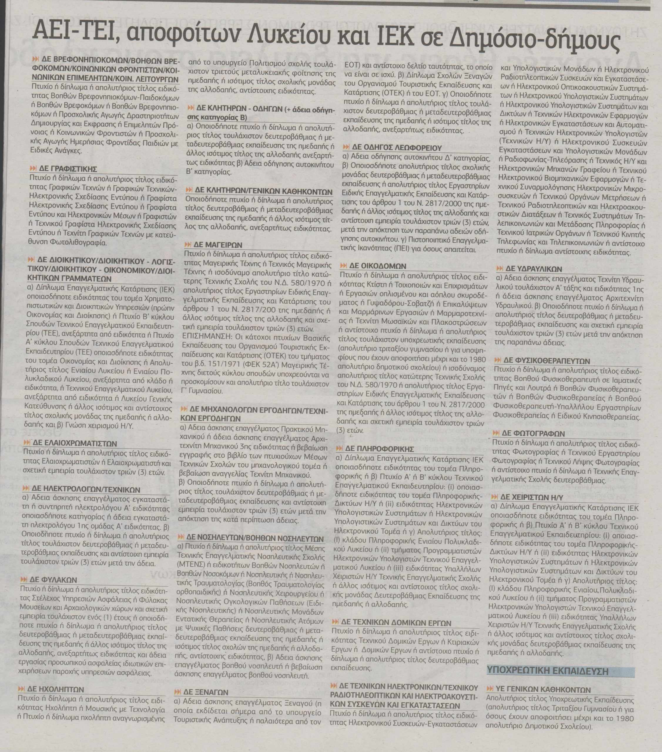 Τέλος, για τις θέσεις ΔΕ, σε κάθε περίπτωση, γίνονται δεκτοί και οι παρακάτω τίτλοι σπουδών: ΙΕΚ ή τεχνικού επαγγελματικού εκπαιδευτηρίου Α΄ ή Β΄ κύκλου σπουδών ή ενιαίου πολυκλαδικού λυκείου ή τεχνικού επαγγελματικού λυκείου ή τεχνικής επαγγελματικής σχολής δευτεροβάθμιας εκπαίδευσης ή σχολής μαθητείας του ΟΑΕΔ του Ν. 1346/1983 ή άλλος ισότιμος τίτλος σχολικής μονάδας της ημεδαπής ή αλλοδαπής, αντίστοιχης ειδικότητας ή οποιοδήποτε πτυχίο ή δίπλωμα ή απολυτήριος τίτλος τουλάχιστον δευτεροβάθμιας ή μεταδευτεροβάθμιας εκπαίδευσης της ημεδαπής ή άλλος ισότιμος τίτλος της αλλοδαπής.