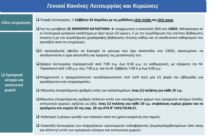 Από το Σάββατο, 24 Απριλίου, επαναλειτουργούν τα εμπορικά κέντρα, τα εκπτωτικά χωριά με τις μεθόδους click inside και click away. Διευκρινίζεται ότι οι καταναλωτές θα πρέπει να στείλουν sms στο 13032 με όριο τριών ωρών για τις αγορές τους. Σημειώνεται, επίσης, ότι είναι υποχρεωτικό ένα self test κάθε εβδομάδα, τόσο για τους εργαζόμενους όσο και για τους επιχειρηματίες. Το κόστος του ενός εξ αυτών βαρύνει το κράτος.