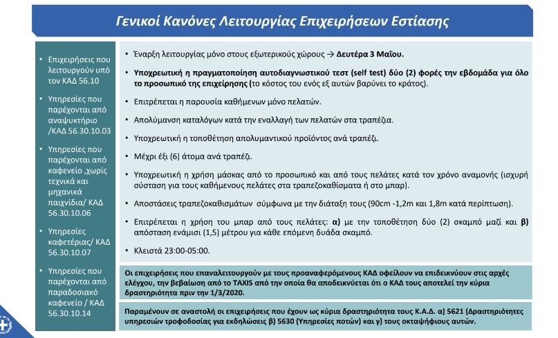 Τη Δευτέρα του Πάσχα, 3 Μαΐου, ξεκινά και η λειτουργία των επιχειρήσεων εστίασης, μόνο στους εξωτερικούς χώρους και με υποχρεωτική πραγματοποίηση self test δυο φορές την εβδομάδα για όλο το προσωπικό. Συγκεκριμένα η απόφαση αφορά στις επιχειρήσεις που λειτουργούν με τον ΚΑΔ 56.10, υπηρεσίες που παρέχονται από αναψυκτήριο/ΚΑΔ 56.30.10.03, υπηρεσίες που παρέχονται από καφενείο χωρίς τεχνικά και μηχανικά παιχνίδια/ΚΑΔ 56.30.10.06, υπηρεσίες καφετέριας/ΚΑΔ 56.30.10.07, υπηρεσίες που παρέχονται από παραδοσιακό καφενείο/ΚΑΔ 56.30.10.14.