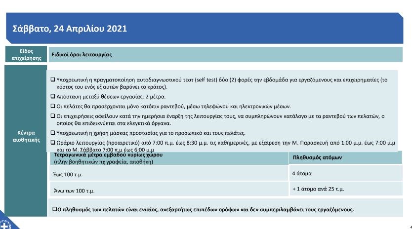 Ακόμη, από το Σάββατο 24 Απριλίου, θα λειτουργήσουν με τη διαδικασία καθορισμού ραντεβού για αγορά εντός καταστήματος (click inside) οι εμπορικές επιχειρήσεις στις Περιφερειακές Ενότητες Θεσσαλονίκης και Κοζάνης (μέχρι σήμερα λειτουργούσαν μόνο με click away). Τέλος, ξεκινούν τη λειτουργία τους και τα κέντρα αισθητικής, όπου είναι υποχρεωτικό το self test δύο φορές την εβδομάδα, τόσο για τους εργαζόμενους όσο και για τους επιχειρηματίες. Το κόστος του ενός εξ αυτών βαρύνει το κράτος. Οι πελάτες θα προσέρχονται μόνο κατόπιν ραντεβού.