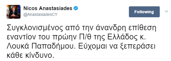 Ο πρόεδρος της Κυπριακής Δημοκρατίας Νίκος Αναστασιάδης με μήνυμά του στο Twitter δήλωσε “συγκλονισμένος από την άνανδρη επίθεση εναντίον του πρώην πρωθυπουργού Λουκά Παπαδήμου“. Παράλληλα, ευχήθηκε να ξεπεράσει κάθε κίνδυνο.