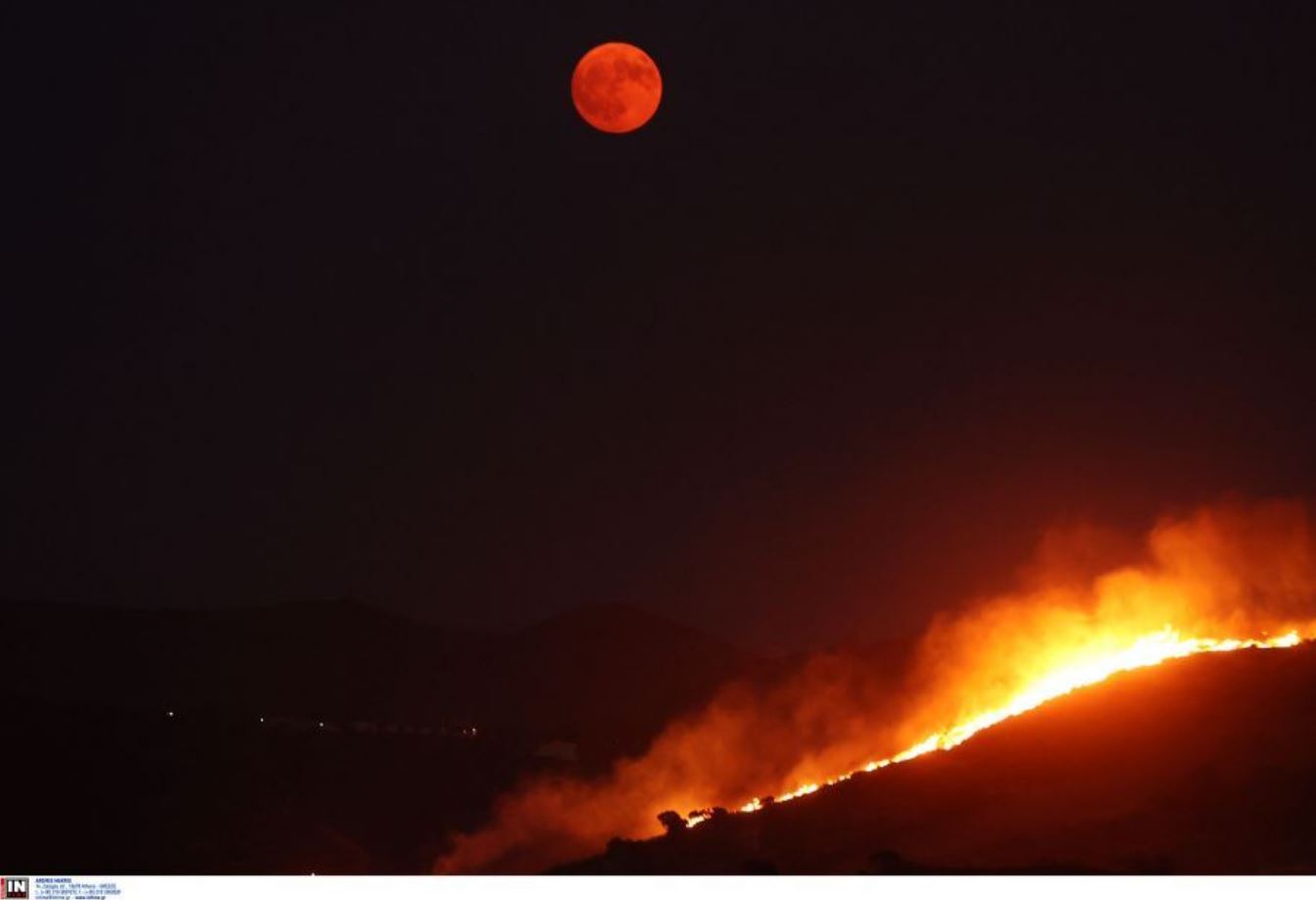 Πάνω από το καμένο τοπίο και τις φλόγες που συνεχίζουν να «καταπίνουν» ό,τι βρουν στο πέρασμά τους στην Ανατολική Αττική, η πανσέληνος δεσπόζει στο βάθος σαν σιωπηλός μάρτυρας της καταστροφής.