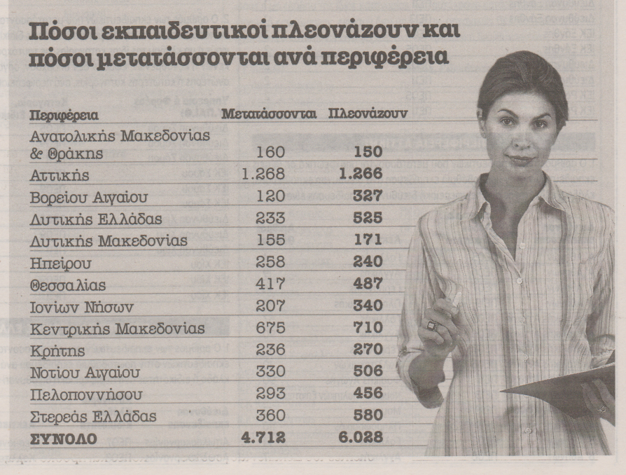 Σύμφωνα με τους πίνακες ανά περιφέρεια, περιοχή και ειδικότητα, πλεονάζουν συνολικά 6.028 εκπαιδευτικοί εκ των οποίων οι 4.712 μετατάσσονται υποχρεωτικά σε δημοτικά σχολεία και σε διοικητικές θέσεις φορέων του υπουργείου Παιδείας.