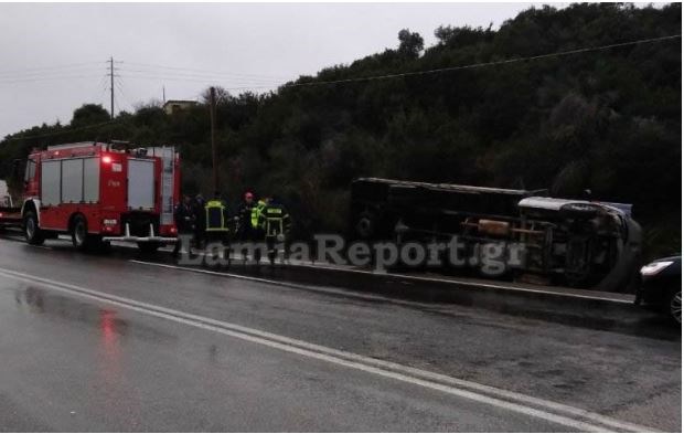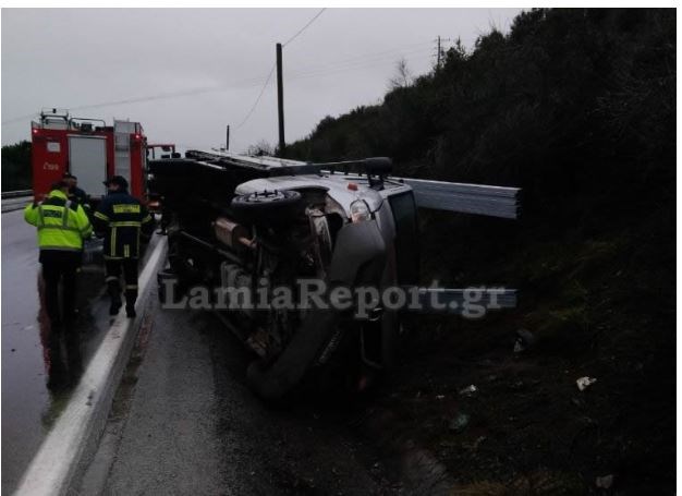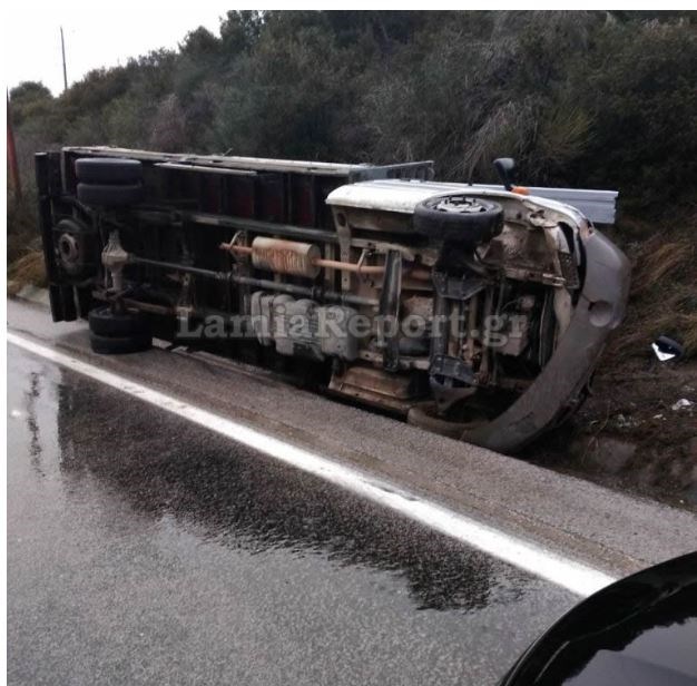 Την ώρα εκείνη έβρεχε και η ολισθηρότητα φαίνεται πως ήταν η κυρία αιτία της ανατροπής του φορτηγού, στο οποίο επέβαιναν δυο άτομα, τα οποία διακομίστηκαν με ασθενοφόρο του ΕΚΑΒ στο ΓΝ Λαμίας. Δεν σημειώθηκε σύγκρουση με άλλο όχημα.