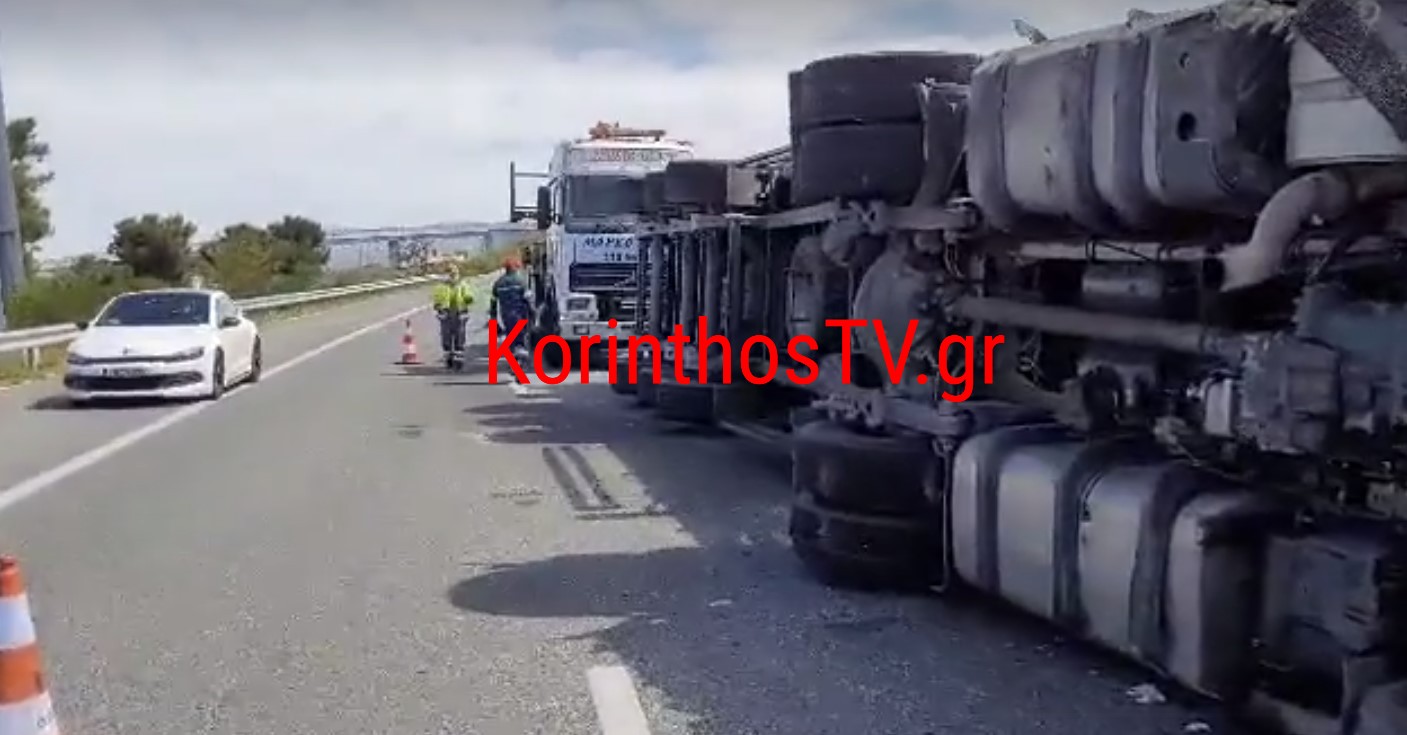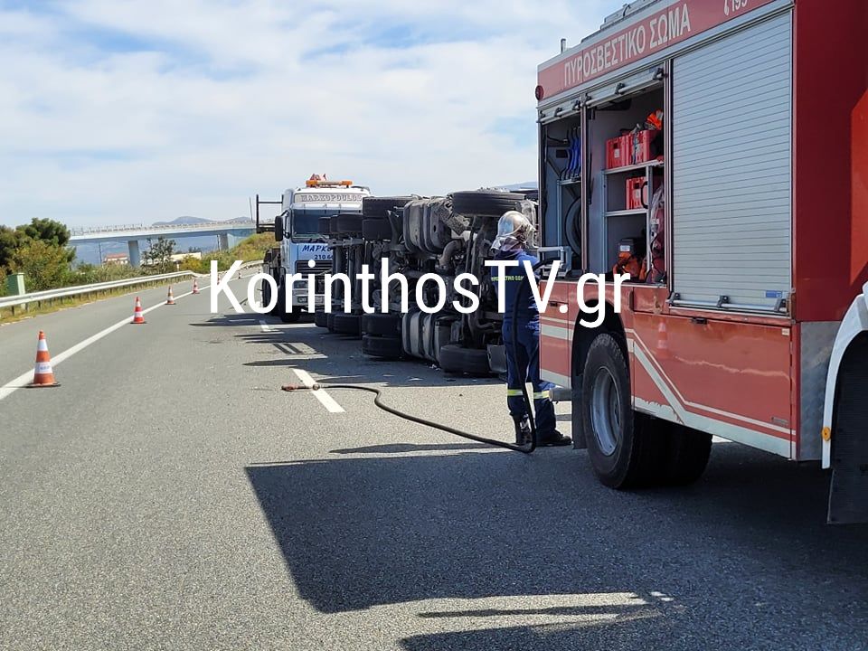 Ανατροπή νταλίκας στην Κορίνθου – Πατρών: Δείτε φωτογραφίες και βίντεο από το σημείο