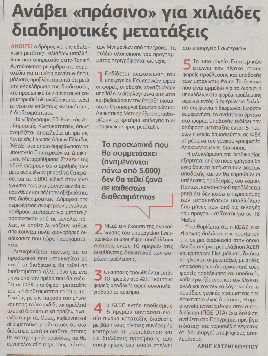 Ανάβει “πράσινο” για χιλιάδες διαδημοτικές μετατάξεις