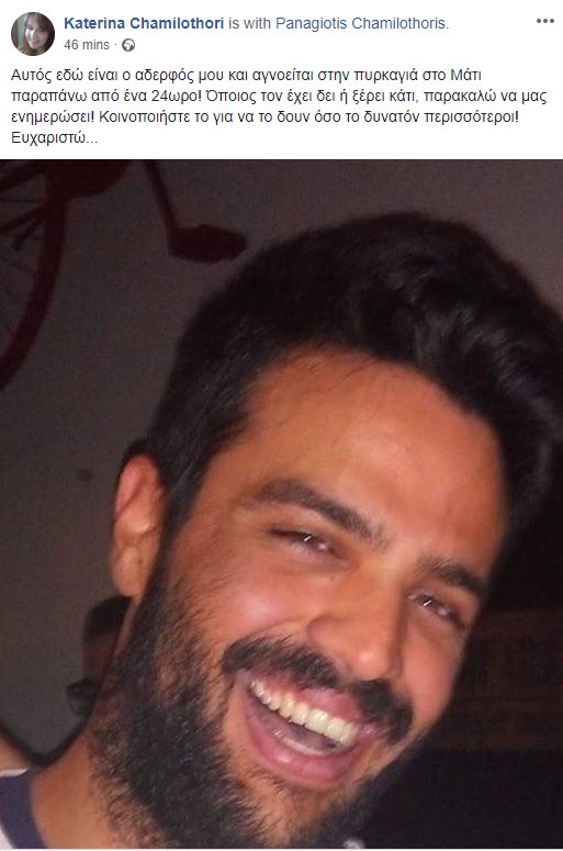 “Αυτός εδώ είναι ο αδερφός μου και αγνοείται στην πυρκαγιά στο Μάτι παραπάνω από ένα 24ωρο! Όποιος τον έχει δει ή ξέρει κάτι, παρακαλώ να μας ενημερώσει! Κοινοποιήστε το για να το δουν όσο το δυνατόν περισσότεροι! Ευχαριστώ…” αναφέρει στον λογαριασμό της στο facebook.