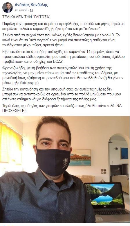 Εξυπακούεται ότι είμαι ήδη από εχθές σε καραντίνα 14 ημερών, ώστε να προστατεύσω κάθε συμπολίτη μου από τη μετάδοση του ιού, όπως εξάλλου προβλέπουν και οι οδηγίες του ΕΟΔΥ.