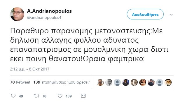 Συγκεκριμένα, ο κ. Ανδριανόπουλος ανέφερε σε tweet του: «Παράθυρο παράνομης μετανάστευσης. Με δήλωση αλλαγής φύλου αδύνατος επαναπατρισμός σε μουσουλμανική χώρα, διότι εκεί ποινή θανάτου! Ωραία φάμπρικα».