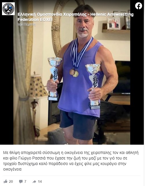 “Με θλίψη αποχαιρετά σύσσωμη η οικογένεια της χειροπάλης τον αθλητή και φίλο Γιώργο Ρασσιά που έχασε την ζωή του μαζί με τον γιο του σε τροχαίο δυστύχημα. Kαλό παράδεισο να έχεις φίλε μας, κουράγιο στην οικογένεια” αναφέρει χαρακτηριστικά η Ομοσπονδία σε ανάρτηση της.