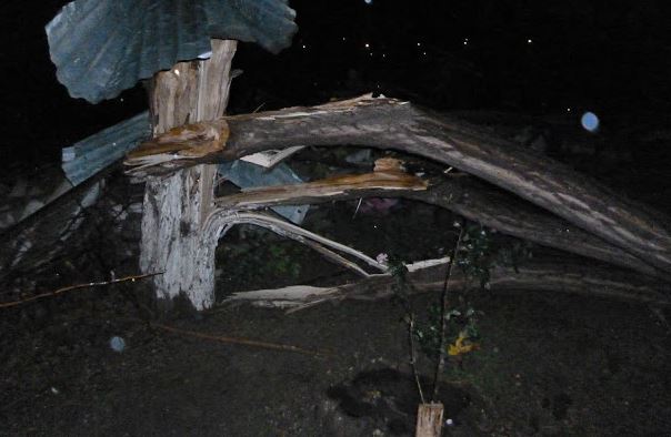 Μέσα σε ελάχιστα δευτερόλεπτα ο ανεμοστρόβιλος κυριολεκτικά σάρωσε τα πάντα στο πέρασμά του, ξηλώνοντας σκεπές από αυλές και σπίτια, κόβοντας στα δύο τις πέτρινες περιφράξεις των αυλών, ξεριζώνοντας δέντρα αλλά και κολώνες της ΔΕΗ.