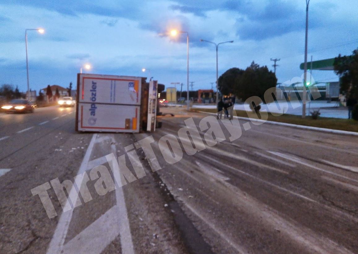 Μία νταλίκα από την Τουρκία ανετράπη το απόγευμα στην Εθνική Οδό, Ξάνθης – Κομοτηνής, στην ανατολική έξοδο της πόλης. Κάτω από αδιευκρίνιστες μέχρι στιγμής συνθήκες ο οδηγός της νταλίκας, που πραγματοποιούσε δρομολόγιο μεταφοράς προϊόντων, έχασε τον έλεγχο του οχήματός του με αποτέλεσμα αυτό να τουμπάρει και να κλείσει εντελώς το ένα ρεύμα του δρόμου. Το όχημα είχε κατεύθυνση την πόλη της Κομοτηνής, ενώ παρά τη σφοδρή ανατροπή, από την οποία προκλήθηκαν υλικές ζημιές στο φορτηγό, ο οδηγός κατάφερε να βγει σώος χωρίς να τραυματιστεί.
