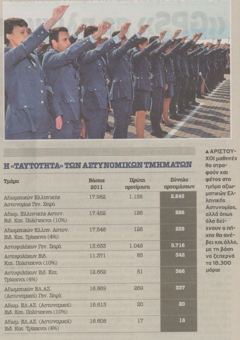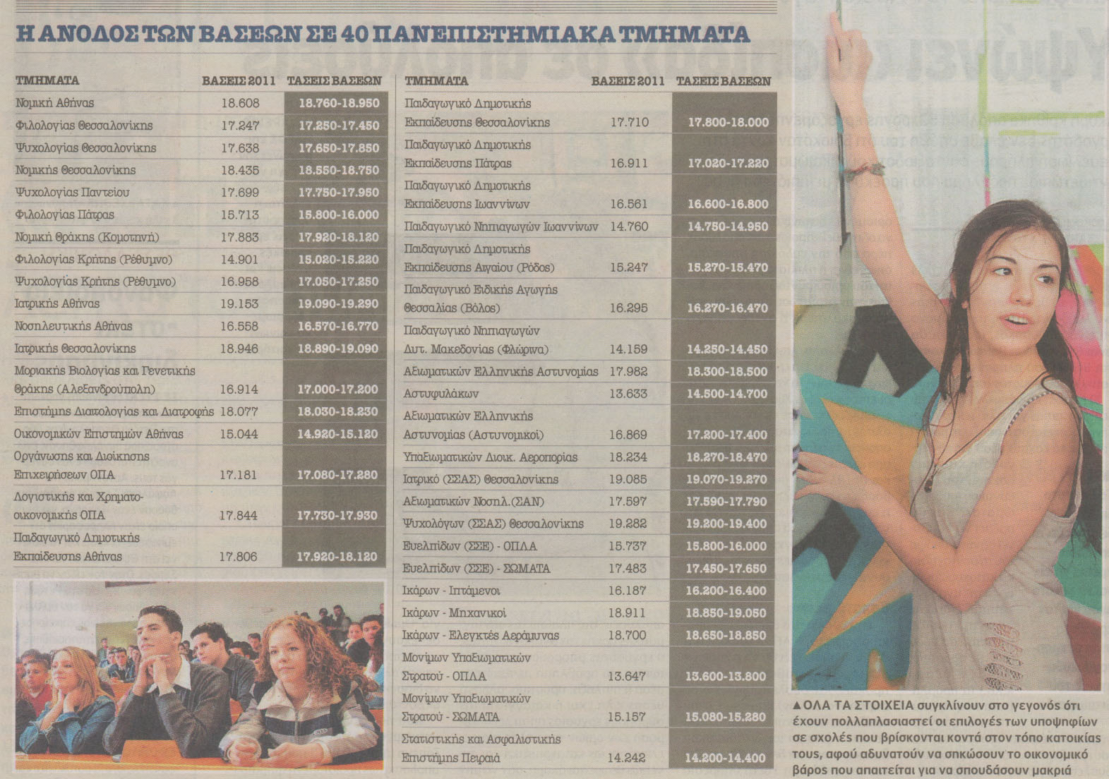 Ανεβαίνει ο πήχης για τουλάχιστον 40 πανεπιστημιακά τμήματα, τα οποία οδηγούν στο Δημόσιο, έχουν καλές προοπτικές στην αγορά εργασίας, ενώ “ψηλώνουν” οι βάσεις και σε πρωτοκλασάτα τμήματα κεντρικών ΑΕΙ.Σε αρκετές περιπτώσεις, όπως για παράδειγμα σε αστυνομικά τμήματα, οι βάσεις αναμένεται να εκτοξευθούν, αφού οι θέσεις σε σχέση με πέρυσι έχουν μειωθεί στο μισό (580 από 1.244).Περισσότερα μόρια σε σχέση με πέρυσι απαιτούνται και για Φιλολογία, Ψυχολογία. ΠΑΤΗΣΤΕ ΠΑΝΩ ΣΤΙΣ ΦΩΤΟΓΡΑΦΙΕΣ ΓΙΑ ΜΕΓΑΛΥΤΕΡΗ ΑΝΑΛΥΣΗ
