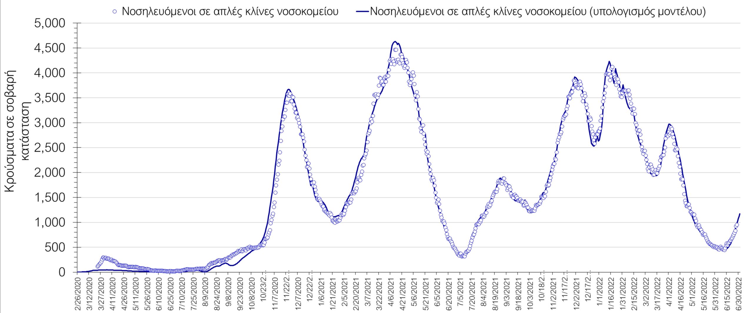 Ο αριθμός των κρουσμάτων που παρατηρείται, είναι σημαντικά υψηλότερος από αυτόν που αναμέναμε όταν ξεκίνησε η αποκλιμάκωση του 5ου κύματος και υποδηλώνει διαφυγή ανοσίας. Επίσης, υπάρχει αυξημένος ρυθμός επαναμολύνσεων ακόμα και σε σύντομο διάστημα από προηγούμενη μόλυνση, που αποτελεί χαρακτηριστικό των νέου παραλλαγών της Ο (ΒΑ.4 και ΒΑ.5), το οποίο είναι ακόμη πιο μεταδοτικό από την παραλλαγή Ο κατά 33% μεσοσταθμικά. Συνεπώς, ο συνδυασμός ολοκληρωτικής χαλάρωσης των μέτρων προστασίας και της παρουσίας των νέων στελεχών, οδήγησαν σε ένα νέο κύμα από την αρχή του Ιουνίου.