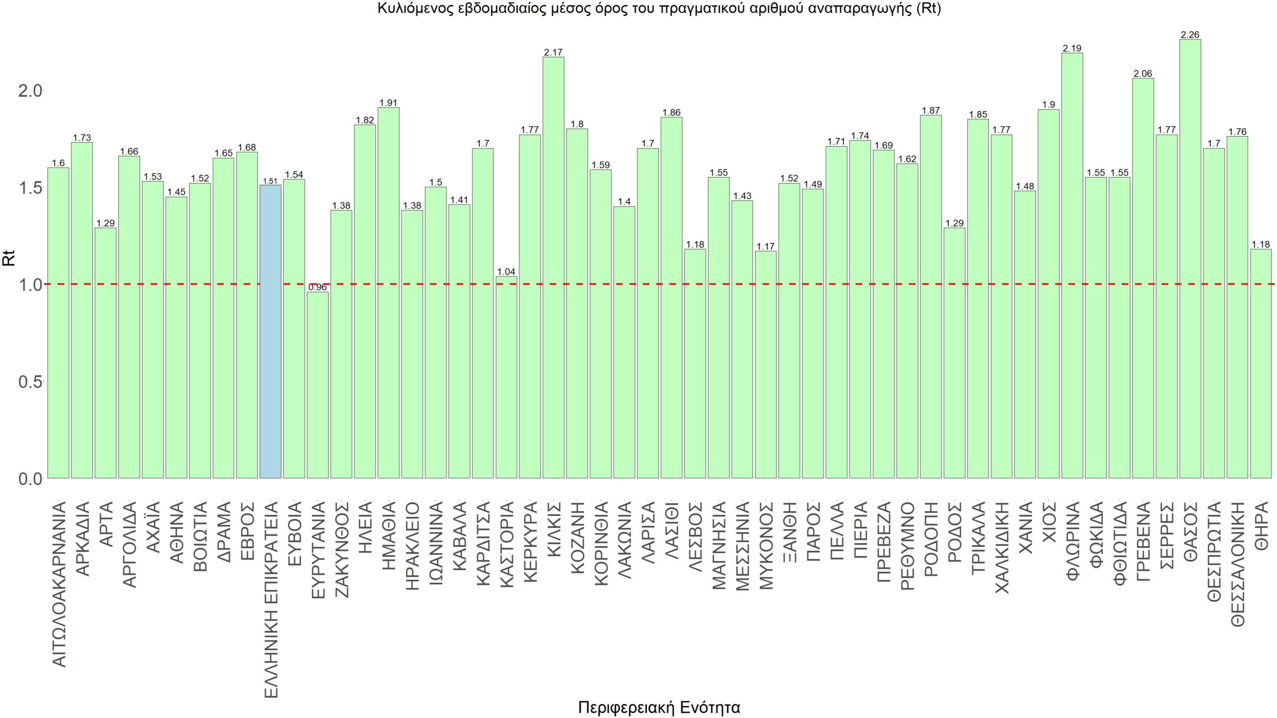 O πραγματικός αριθμός αναπαραγωγής Rt ανά περιφερειακή ενότητα της χώρας παρουσιάζεται στο Σχήμα 58.