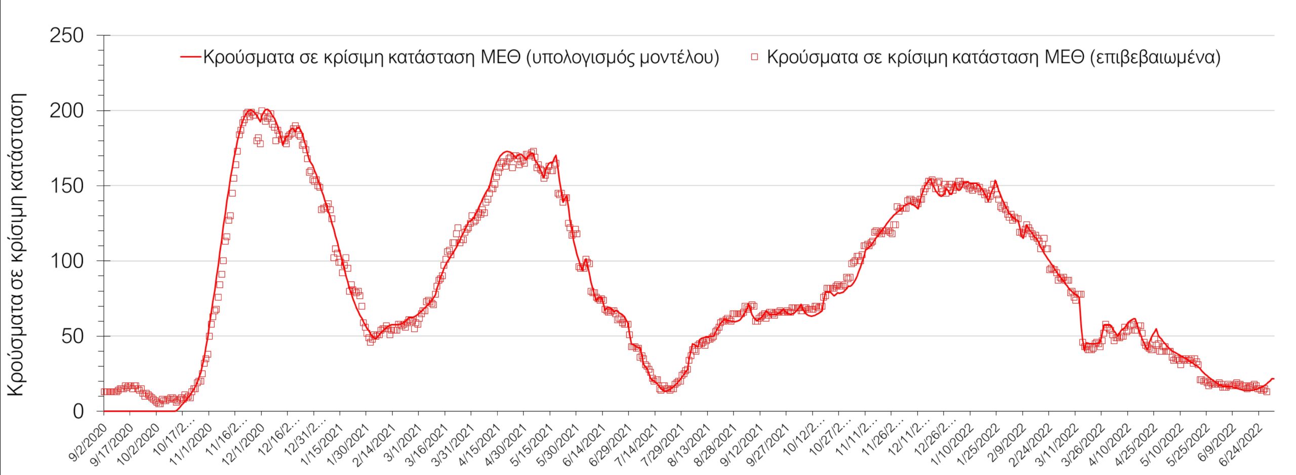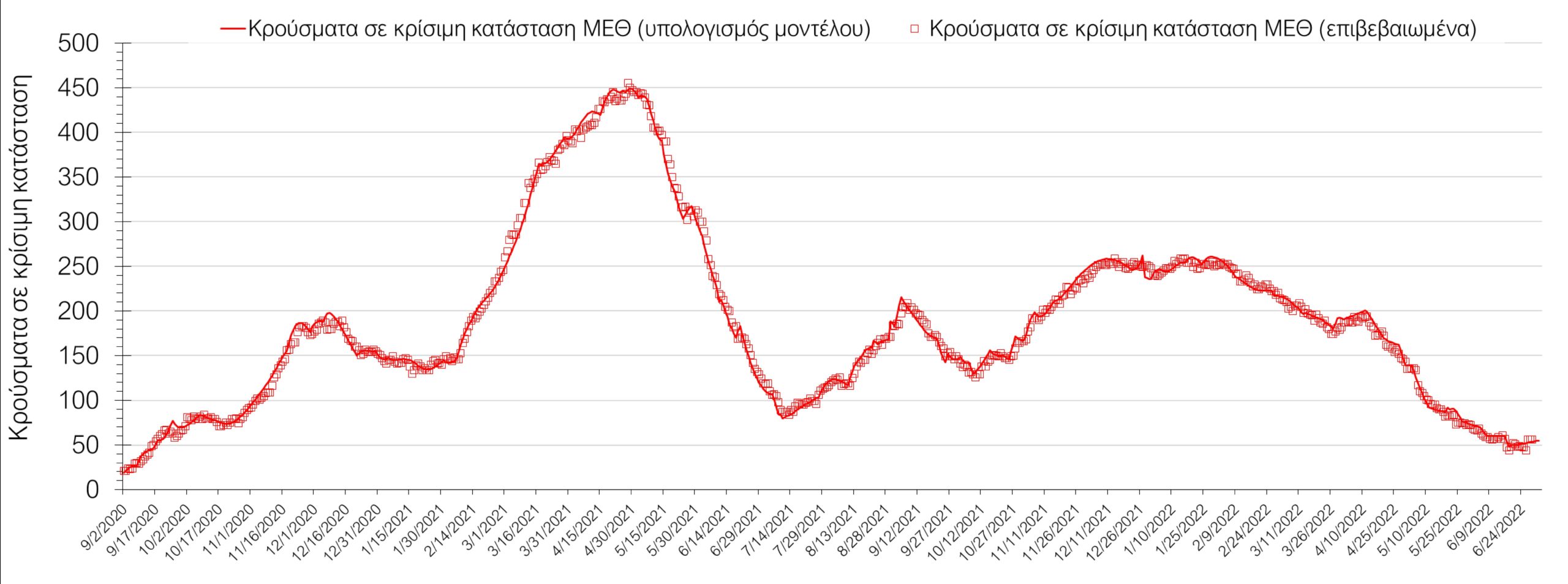 Σχήμα 1. Αριθμός κρουσμάτων σε κρίσιμη κατάσταση (ΜΕΘ) σύμφωνα με τα στοιχεία του ΕΟΔΥ και τις προβλέψεις της υπολογιστικής πλατφόρμας CORE.