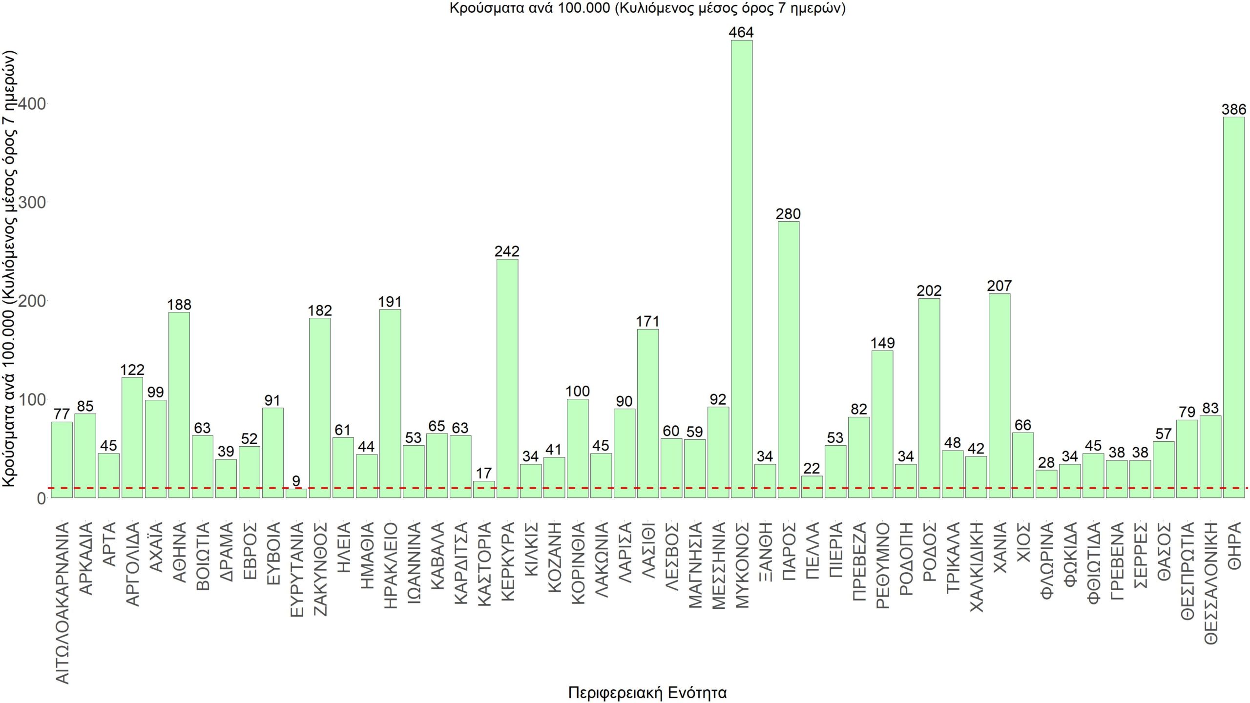 Η συγκεντρωτική εικόνα των νέων κρουσμάτων ανά 100.000 κατοίκους (κυλιόμενος μέσος όρος 7 ημερών) των επιμέρους περιοχών παρουσιάζεται στο Σχήμα 60. Όλες οι περιοχές παραμένουν πάνω από το όριο ανησυχίας.