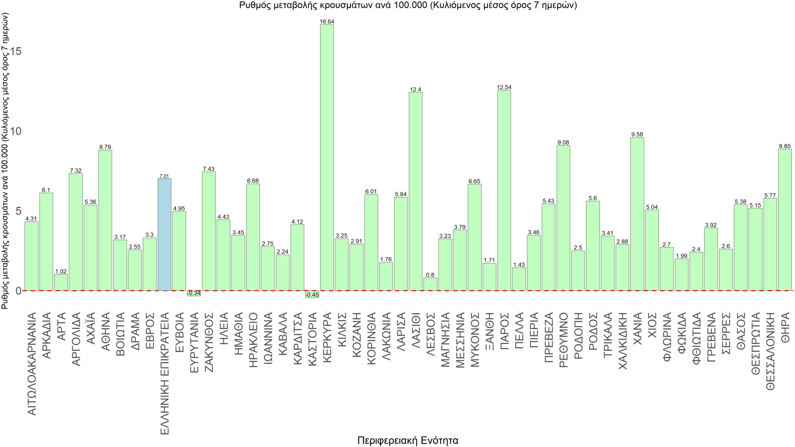 Η αποτύπωση των τάσεων στις επιμέρους περιοχές, παρουσιάζεται στο Σχήμα 61, όπου παρουσιάζεται ο ρυθμός μεταβολής των νέων κρουσμάτων ανά 100.000 κατοίκους (κυλιόμενος μέσος όρος 7 ημερών) των επιμέρους περιοχών. Θετικές τιμές του ρυθμού μεταβολής υποδηλώνουν άνοδο, ενώ αρνητικές τιμές υποδηλώνουν πτωτική πορεία.