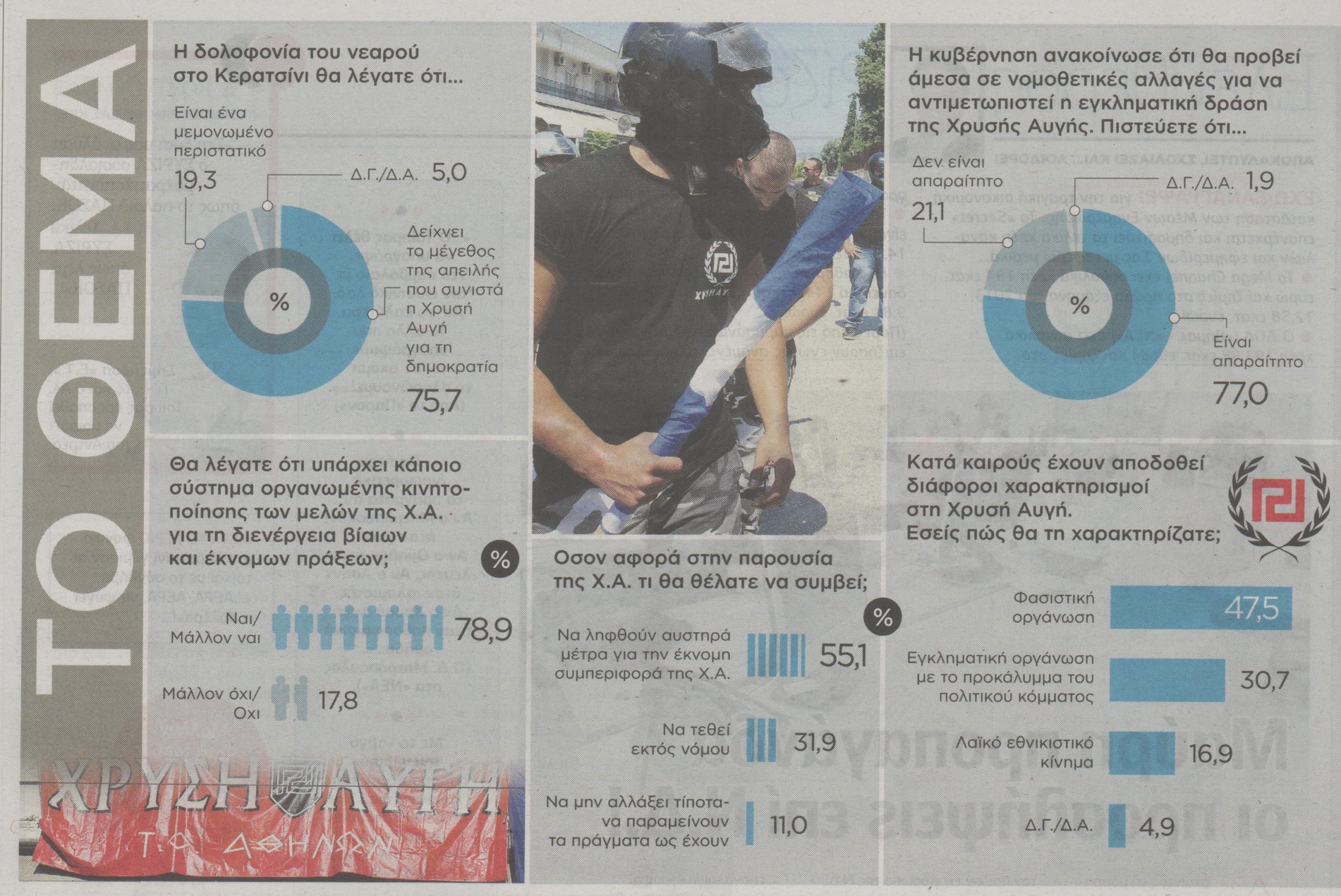Στην πρώτη δημοσκόπηση που διενεργήθηκε αμέσως μετά την εγκληματική επίθεση, δηλαδή στο τριήμερο από 19 έως 21 Σεπτεμβρίου, σχεδόν 8 στους 10 πολίτες χαρακτηρίζουν τη Χρυσή Αυγή φασιστική ή εγκληματική οργάνωση, ενώ το 87% πιστεύει ότι «κάτι πρέπει να αλλάξει» για το κόμμα του Νίκου Μιχαλολιάκου.