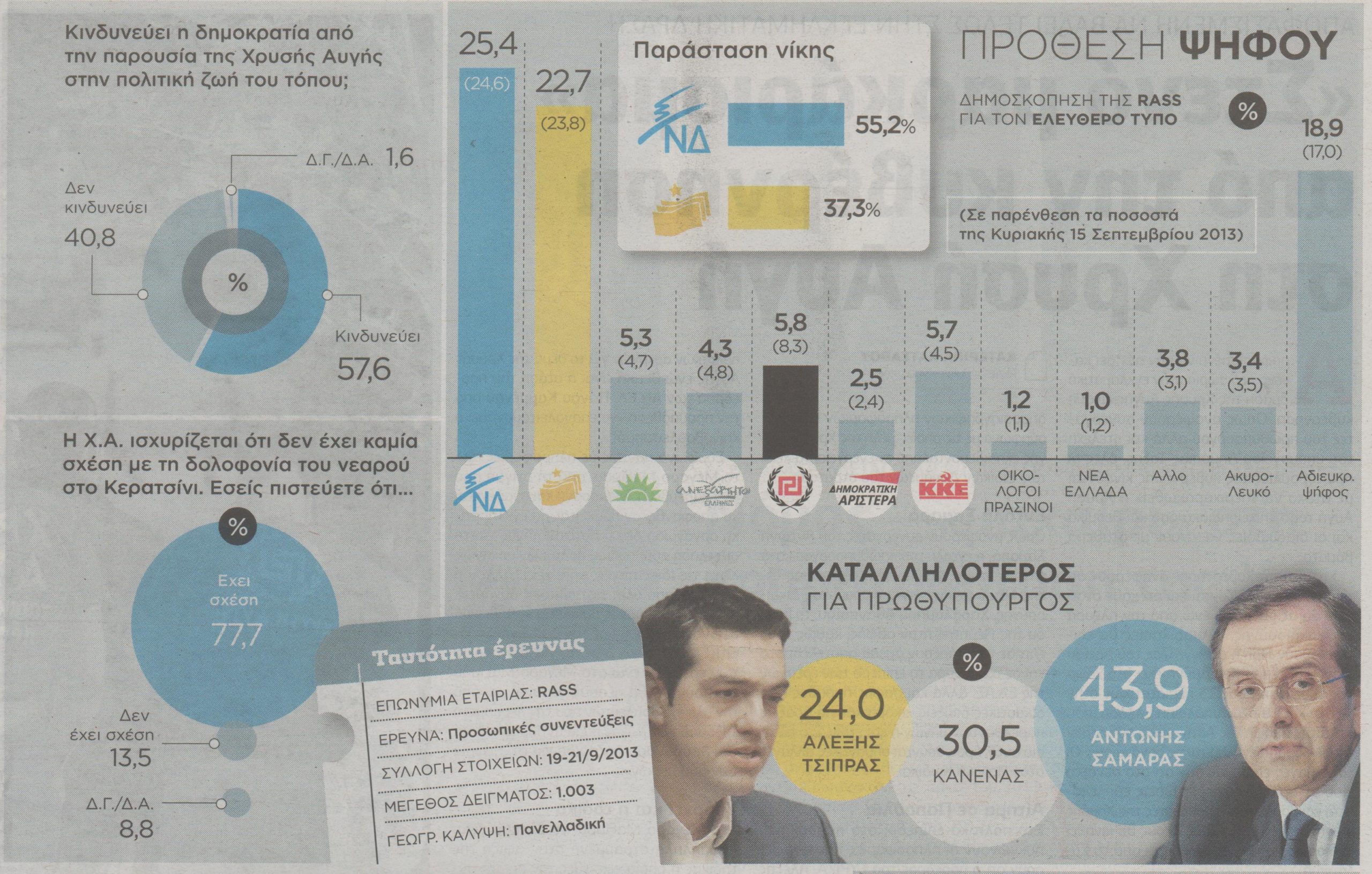 Είναι ενδεικτικό ότι στην αντίστοιχη δημοσκόπηση της Rass που διενεργήθηκε από τις 10 μέχρι τις 12 Σεπτεμβρίου στον πίνακα των μετακινήσεων ψηφοφόρων, η ΝΔ «έχανε προς τη Χρυσή Αυγή 3,4%, ενώ τώρα η διαρροή βρίσκεται στο 1,4%.