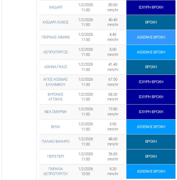 Συγκεκριμένα, βροχόπτωση σημειώνεται σε Νίκαια, Υμηττό, Πειραιά, Ηλιούπολη, Κορυδαλλό, Ελευσίνα, Άλιμο, Χαϊδάρι, Γκάζι, Βύρωνα, Νέα Σμύρνη, Μαρούσι, καθώς και σε άλλες περιοχές.