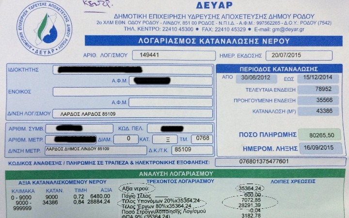 Σύμφωνα με τη «Ροδιακή», ο υπέρογκος λογαριασμός έφτασε σε μια μικρή ξενοδοχειακή μονάδα της Λάρδου, η οποία είναι άγνωστο αν ο ετήσιος τζίρος της μπορεί να «σηκώσει» αυτό το ποσό.