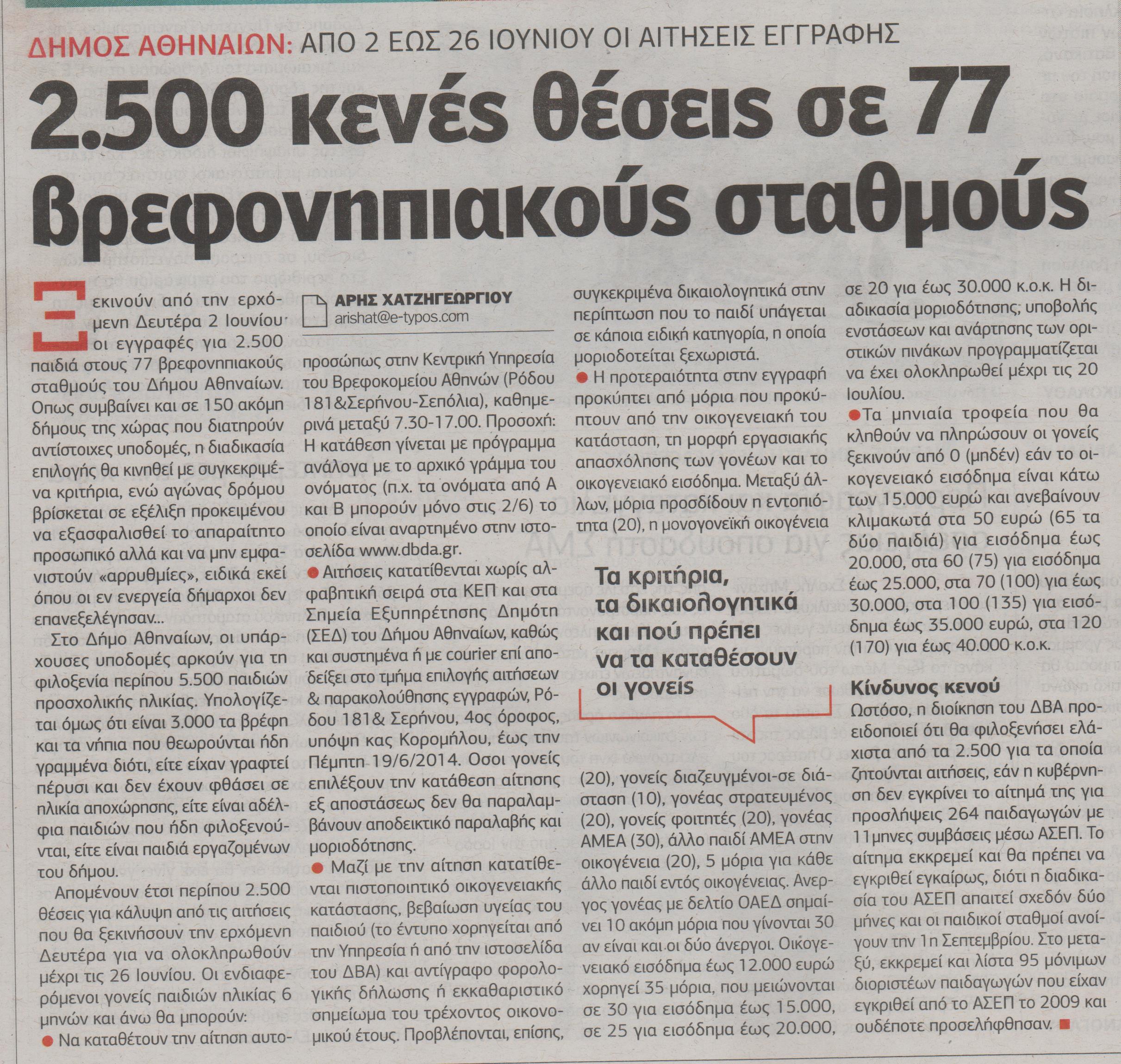 Ξεκινούν από τη Δευτέρα 2 Ιουνίου οι εγγραφές για 2.500 παιδιά στους 77 βρεφονηπιακούς σταθμούς του δήμου Αθηναίων. Όπως συμβαίνει και σε 150 ακόμη δήμους της χώρας που διατηρούν αντίστοιχες υποδομές, η διαδικασία επιλογής θα κινηθεί με συγκεκριμένα κριτήρια, ενώ αγώνας δρόμου βρίσκεται σε εξέλιξη προκειμένου να εξασφαλισθεί το απαραίτητο προσωπικό αλλά και να μην εμφανιστούν «αρρυθμίες» ειδικά εκεί όπου οι εν ενεργεία δήμαρχοι δεν επανεξελέγησαν.