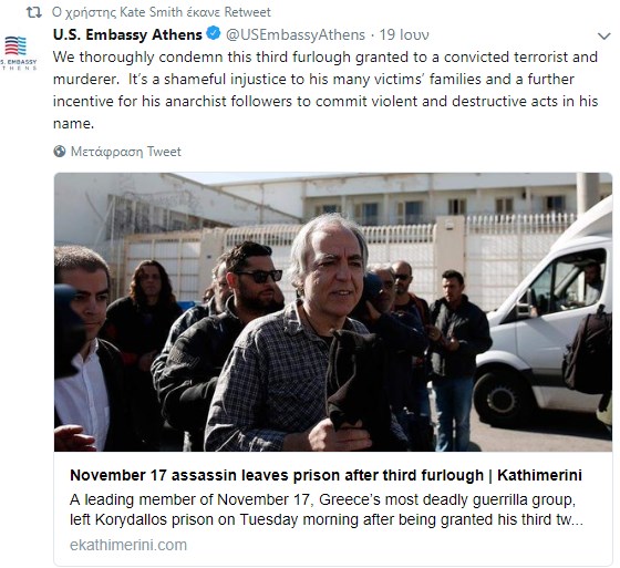 «Συμφωνώ. Η θέση μας είναι γνωστή. Προσβολή στη μνήμη των θυμάτων και στις οικογένειές τους», έγραψε σήμερα σε ανάρτησή της στον προσωπικό της λογαριασμό στο Twitter, η Kate Smith, έχοντας αναδημοσιεύσει στην αμέσως προηγούμενη ανάρτησή της την ανακοίνωση της αμερικανικής πρεσβείας, με την οποία εκφράζει την καταδίκη της «για την τρίτη χορήγηση άδειας στον καταδικασμένο τρομοκράτη και δολοφόνο».