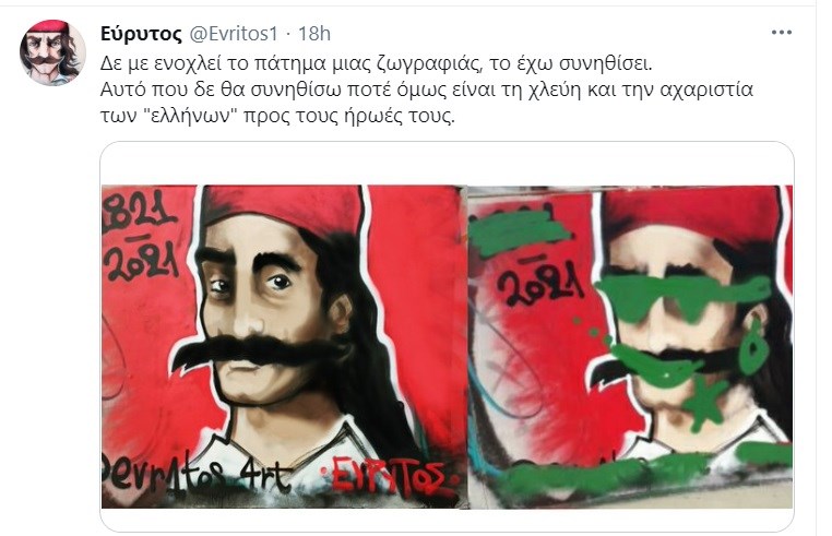 Ο ίδιος ο “Εύρυτος” σχολιάζοντας τη βεβήλωση έγραψε σε ανάρτησή του στο Twitter: “Δε με ενοχλεί το πάτημα μιας ζωγραφιάς, το έχω συνηθίσει. Αυτό που δε θα συνηθίσω ποτέ όμως είναι τη χλεύη και την αχαριστία των “Ελλήνων” προς τους ήρωές τους”