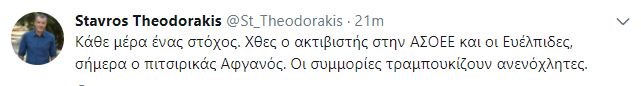 “Κάθε μέρα ένας στόχος. Χθες ο ακτιβιστής στην ΑΣΟΕΕ και οι Ευέλπιδες, σήμερα ο πιτσιρικάς Αφγανός. Οι συμμορίες τραμπουκίζουν ανενόχλητες” σχολιάζει σε ανάρτησή του στο twitter, ο επικεφαλής του Ποταμιού, Σταύρος Θεοδωράκης.