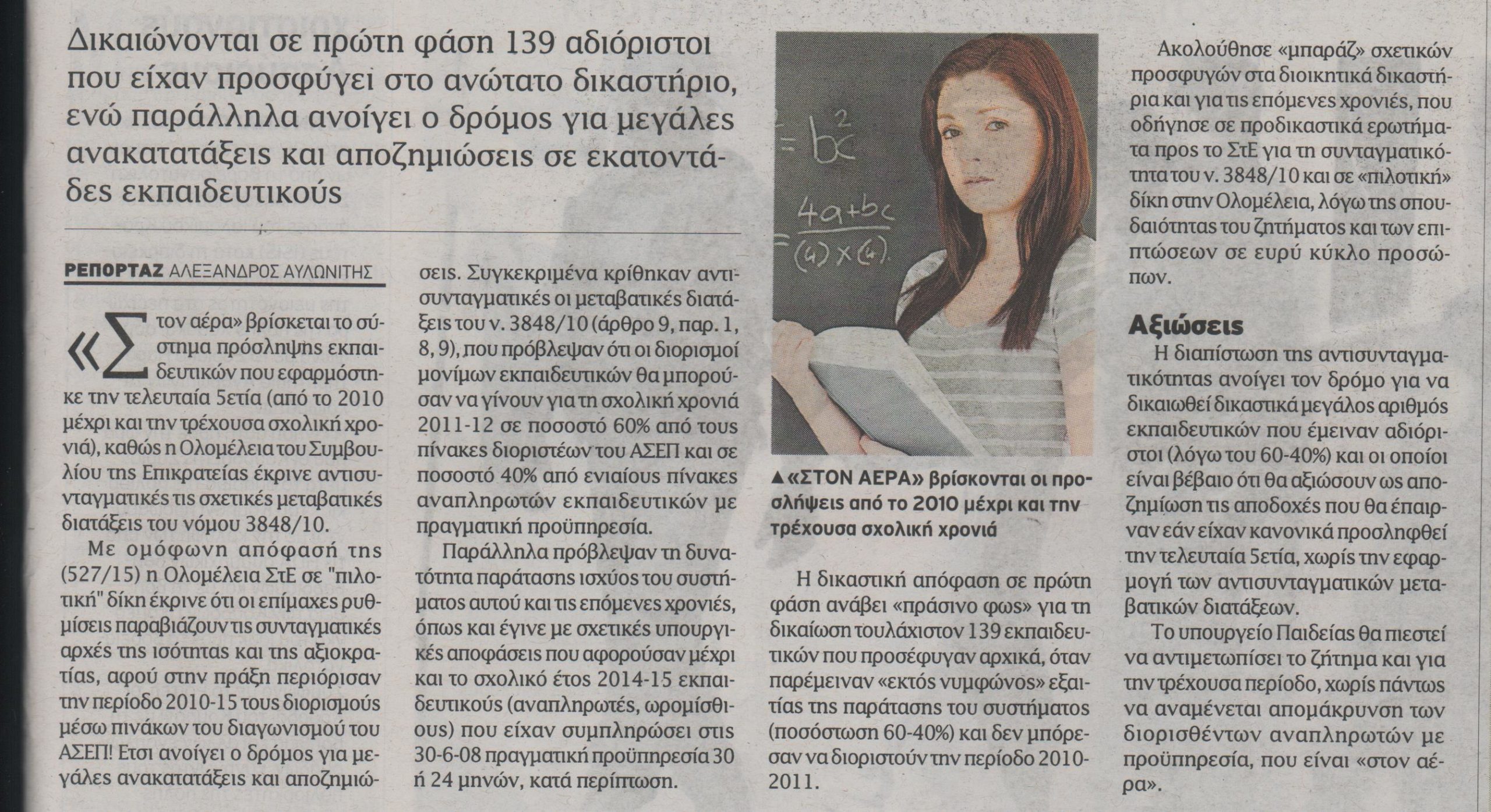 «Στον αέρα» βρίσκεται το σύστημα πρόσληψης εκπαιδευτικών που εφαρμόστηκε την τελευταία 5ετία (από το 2010 μέχρι και την τρέχουσα σχολική χρονιά), καθώς η Ολομέλεια του Συμβουλίου της Επικρατείας έκρινε αντισυνταγματικές τις σχετικές μεταβατικές διατάξεις του νόμου 3848/10.