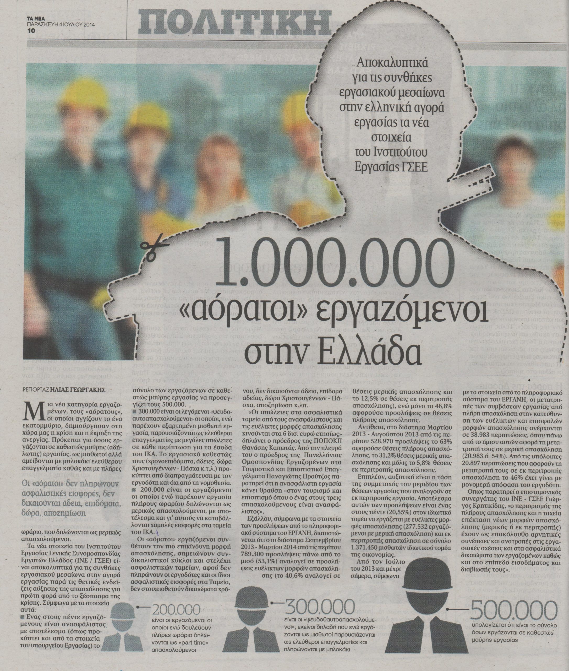 Τα νέα στοιχεία του Ινστιτούτου Εργασίας Γενικής Συνομοσπονδίας Εργατών Ελλάδος (ΙΝΕ/ΓΣΕΕ) είναι αποκαλυπτικά για τις συνθήκες εργασιακού μεσαίωνα στην αγορά εργασίας παρά τις θετικές ενδείξεις αύξησης της απασχόλησης για πρώτη φορά από το ξέσπασμα της κρίσης.
