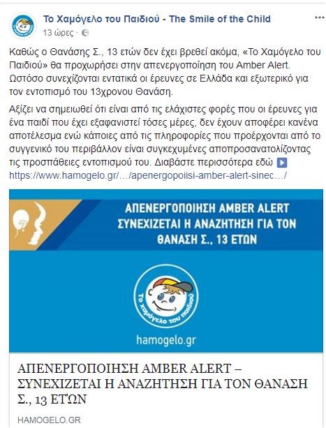 Το Χαμόγελο του Παιδιού επισημαίνει πως εάν ο 13χρονος πράγματι βρίσκεται στο εξωτερικό θα εγερθούν «ερωτηματικά για το πόσο εύκολα ένα παιδί μετακινείται μεταξύ κρατών» τη στιγμή μάλιστα που είχε δηλωθεί η εξαφάνισή του.