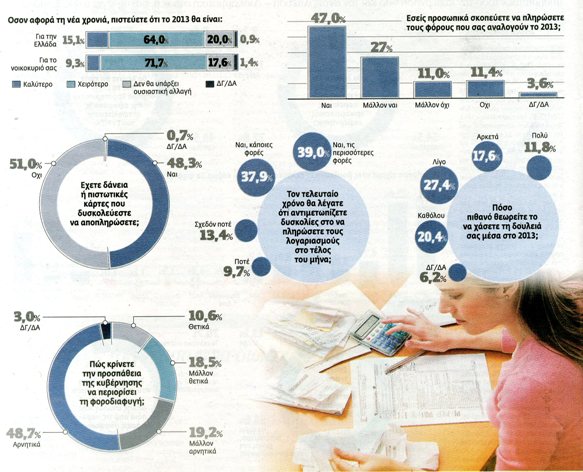 Το 64% των ερωτηθέντων κρίνει ότι το νέο έτος θα είναι χειρότερο από το 2012 για τη χώρα και το 71,7% χειρότερο για τους ίδιους προσωπικά. Το 40,9% δεν πιστεύει ότι άλλαξε κάτι ουσιαστικά με την εκταμίευση της δόσης και μόνο το 1/3 εμφανίζεται πιο αισιόδοξο.