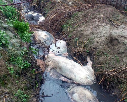 Νεκρά γουρούνια, μικρά και μεγάλα, πεταμένα μέσα σ ΄αυτόν τον βούρκο να επιπλέουν, κατά δεκάδες. Αδέσποτα σκυλιά να χορταίνουν την πείνα τους, με αυτά τα κουφάρια, μέσα στα διπλανά χωράφια. Μια δηλαδή άκρως επικίνδυνη κατάσταση για την δημόσια υγεία.