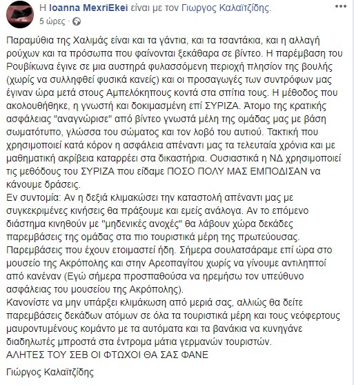 «Κανονίστε να μην υπάρξει κλιμάκωση από μεριά σας, αλλιώς θα δείτε παρεμβάσεις δεκάδων ατόμων σε όλα τα τουριστικά μέρη και τους νεόφερτους μαυροντυμένους κομάντο με τα αυτόματα και τα βανάκια να κυνηγάνε διαδηλωτές μπροστά στα έντρομα μάτια γερμανών τουριστών», πρόσθεσε.