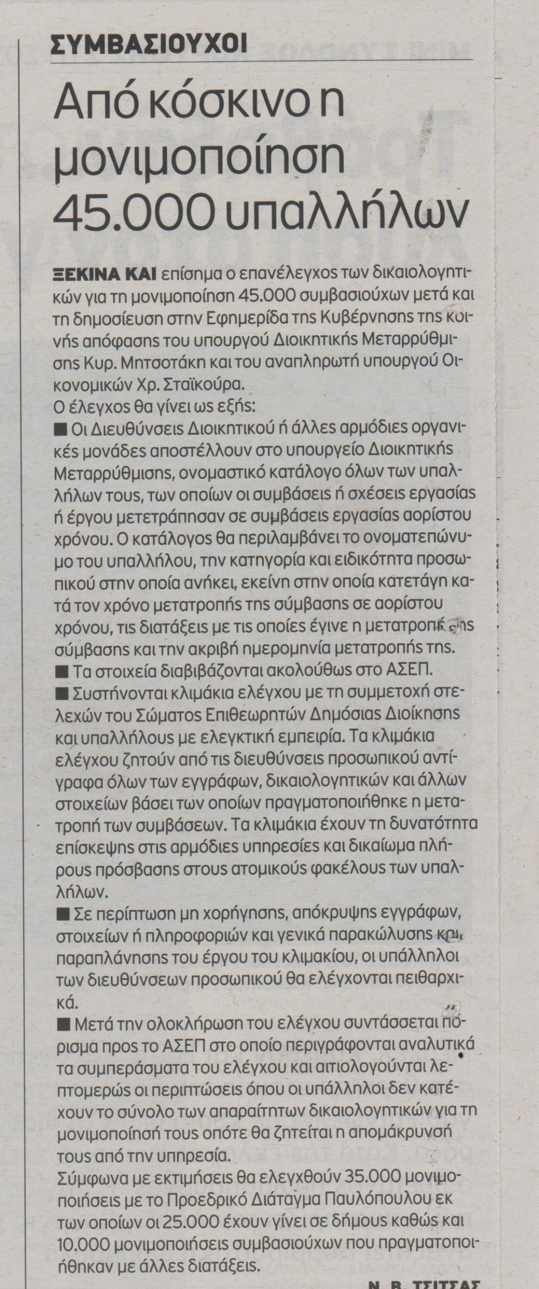 Ξεκινά και επίσημα ο επανέλεγχος των δικαιολογητικών για τη μονιμοποίηση 45.000 συμβασιούχων μετά και τη δημοσίευση στην Εφημερίδα της Κυβέρνησης της κοινής απόφασης του υπουργού Διοικητικής Μεταρρύθμισης, Κυριάκου Μητσοτάκη, και του αναπληρωτή υπουργού Οικονομικών, Χρήστου Σταϊκούρα.
