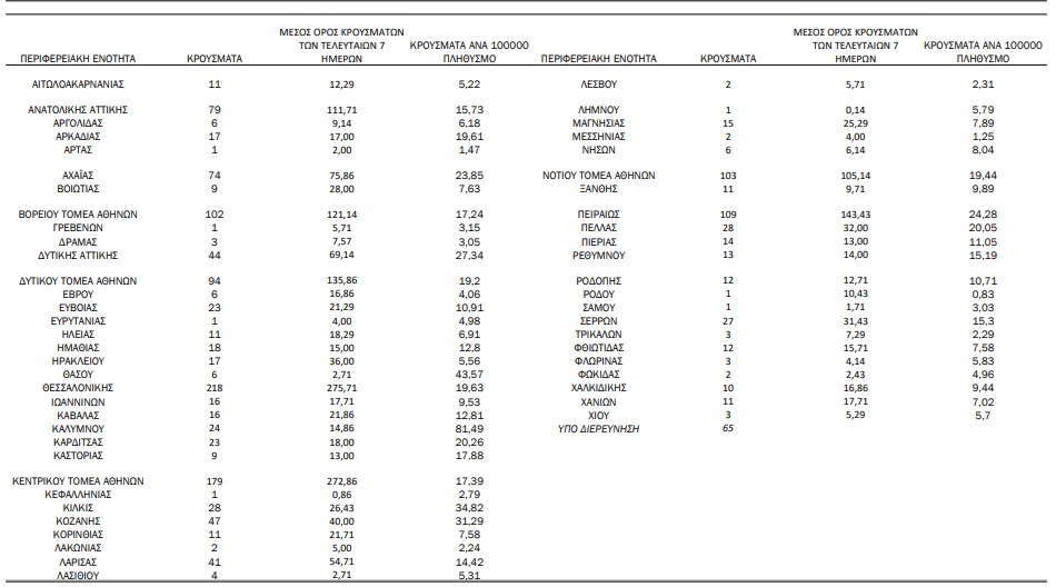 Υψηλά νούμερα παρουσίασαν η Αχαΐα (74), η Κοζάνη (47) και η Λάρισα (41), ενώ παραμένει πιεστική η κατάσταση στην Πέλλα (28).