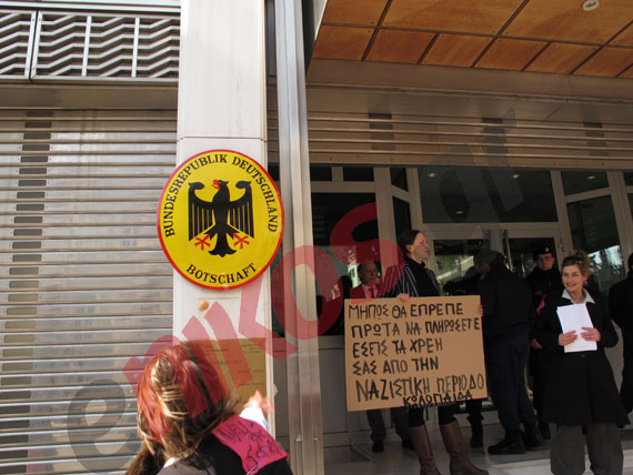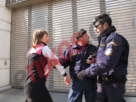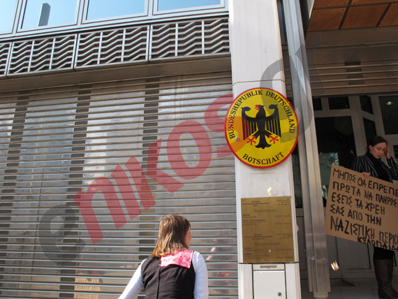 ΡΕΠΟΡΤΑΖ ΜΑΡΙΑ ΠΑΠΑ ΦΩΤΟΓΡΑΦΙΕΣ : ΣΤΕΛΙΟΣ ΜΑΤΣΑΓΓΟΣ Ενώ οι 10 ακτιβιστές φώναζαν συνθήματα εναντίον της Γερμανικής Κυβέρνησης, η Γερμανίδα που βλεπετε στις φωτογραφίες, πέταξε ένα βρασμένο αυγό στο σύμβολο της Γερμανίας, με αποτέλεσμα την άμεση προσαγωγή της από τους Έλληνες αστυνομικούς που παρακολουθούσαν σε κοντινή απόσταση. Οι υπόλοιποι Γερμανοί ακτιβιστές και ο Πρόεδρος της ΕΣΗΕΑ Δημήτρης Τρίμης, επιχείρησαν να εμποδίσουν την προσαγωγή της αλλά χωρίς τελικά να τα καταφέρουν…