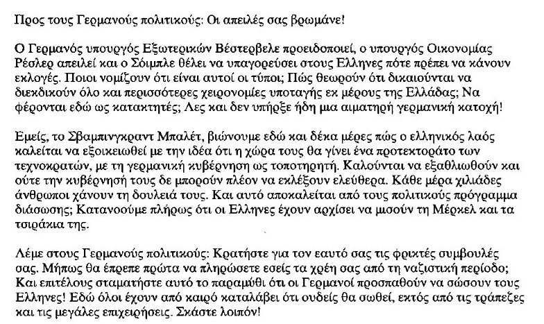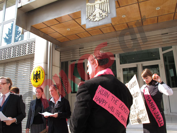 Ρεπορτάζ: Μαρία ΠαππάΦωτογραφίες: Στέλιος Ματσάγγος Διαμαρτυρία έξω από τη γερμανική πρεσβεία πραγματοποίησε σήμερα το πρωί ομάδα Γερμανών (καλλιτεχνών και δημοσιογράφων) ενάντια στη στάση της πατρίδας τους απέναντι στη χώρα μας αλλά και κατά της μνημονιακής πολιτικής και την επιβολή των νέων μέτρων. Οι Γερμανοί, που σε μόνιμη βάση διαβιούν στο Αμβούργο, ήρθαν στην Ελλάδα προκειμένου να διαμαρατυρηθούν στο πλευρό των Ελλήνων για την “κατάφορη αδικία” κατά της χώρας μας, όπως οι ίδιοι δηλώνουν.Οι ακτιβιστές που ονομάζονται Μπαλέτο του Σβάμπιγκραντ, είχαν έγραψαν μια επιστολή στην οποία εξέθεταν τα “αδικήματα της Ευρώπης εις βάρος των Ελλήνων”, με σκοπό να την παραδώσουν στο Γερμανό πρέσβη. Ωστόσο αυτό στάθηκε αδύνατον, καθώς δεν επετράπη στον εκπρόσωπό τους ούτε καν να περάσει το κατώφλι της εισόδου. Αντιδρώντας στην αναίτια απαγόρευση της εισόδου τους στην πρεσβεία πραγματοποίησαν ένα δρώμενο, υψώνοντας πλακάτ που έγραφαν: “ξεπούλημα της Ελλάδας, όχι στο όνομά μας”, “πληρώστε πρώτα τα χρέη από τη ναζιστική κατοχή” τραγουδώντας και φωνάζοντας συνθήματα. Οι υπάλληλοι της πρεσβείας ενοχλημένοι κάλεσαν την Αστυνομία. Το κείμενο της επιστολής των Γερμανών ακτιβιστών από το Αμβούργο