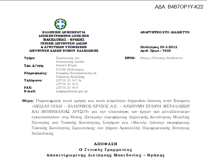 Παραχωρήθηκε κατά χρήση και κατά κυριότητα δημόσιο δάσος στην Εταιρεία «HELLAS GOLD – ΕΛΛΗΝΙΚΟΣ ΧΡΥΣΟΣ Α.Ε.» για την υλοποίηση των έργων των μεταλλευτικών εγκαταστάσεων στις θέσεις Σκουριές και Μαντέμ Λάκκος στη Χαλκιδική, με απόφαση του Γενικού Γραμματέα της Αποκεντρωμένης Διοίκησης Μακεδονίας Θράκης Θύμιου Σώκου την Πέμπτη 29 Μαρτίου. Η παραχώρηση γίνεται με χρηματικό αντάλλαγμα, και σύμφωνα με όσα αναφέρονται στην απόφαση, το ποσό ανταλλάγματος χρήσης γης, καθορίζεται στα 2.200.0121, 19 ευρώ. Δείτε ολόκληρη την απόφαση όπως δημοσιεύτηκε στη Διαύγεια