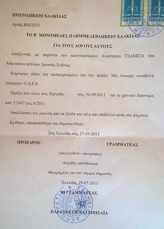 Όπως αναφέρει το eviazoom.gr, το δικαστήριο έγινε στις 27 Μαΐου 2013, αλλά η απόφαση έγινε γνωστή πριν λίγες ημέρες, όταν ο επιχειρηματίας θέλησε να δημοσιεύσει το έγγραφο, για να βοηθήσει, όπως είπε, τους οφειλέτες που συλλαμβάνονται για χρέη στον ΟΑΕΕ.