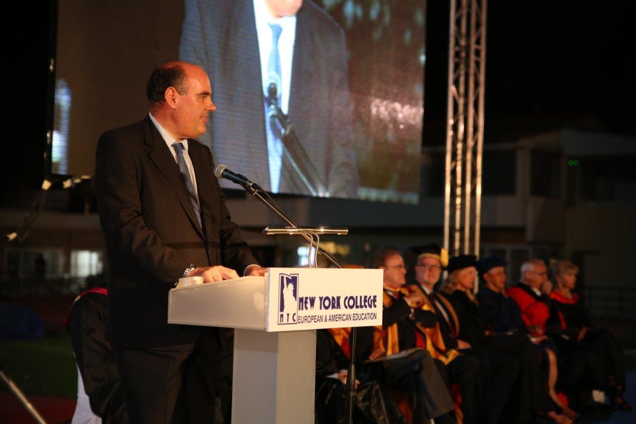 Από τις πιο συγκινησιακά φορτισμένες στιγμές υπήρξε η ομιλία του Κόμη του St. Andrews και Καγκελάριου του Πανεπιστημίου του Bolton, ο οποίος επικαλούμενος την ελληνική του καταγωγή, απευθύνθηκε στους παρευρισκόμενους στα ελληνικά! «Ο Ισοκράτης προέτρεψε να συλλέγουμε το καλύτερο από τη γνώση, όπως ακριβώς η μέλισσα κάθεται βέβαια πάνω σε όλα γενικά τα άνθη, παίρνει όμως από το καθένα τα καλύτερα συστατικά. Το Πανεπιστήμιο του Bolton και το New York College έχουν πετύχει πολλά με βασικό κίνητρο πάντα το βέλτιστο για τους φοιτητές μας», είπε χαρακτηριστικά.