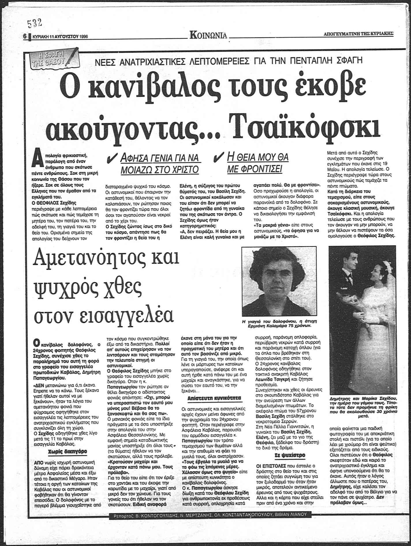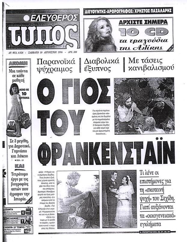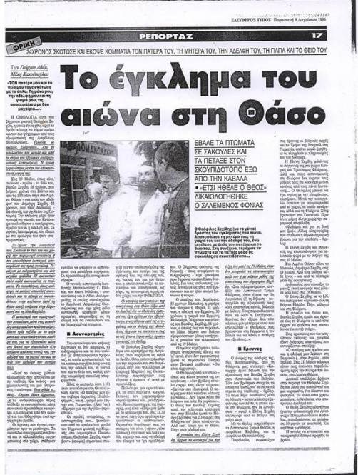 «Το έγκλημα του αιώνα στη Θάσο», «Ο γιος του Φρανκεστάιν», «Αμόκ αίματος στη Θάσο», «Ο κανίβαλος που άκουγε… Τσαϊκόφκσι» ήταν μερικά από τα πρωτοσέλιδα στις αρχές του Αυγούστου του 1996, όταν το νησί της Θάσου έμελλε να μονοπωλήσει το ενδιαφέρον της κοινής γνώμης μετά την αποκάλυψη της πενταπλής ανθρωποκτονίας του μαζικού δολοφόνου Θεόφιλου Σεχίδη.
