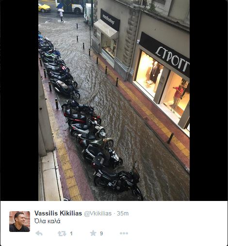 Στην φωτογραφία διακρίνεται ο πλημμυρισμένος δρόμος στην οδό Κριεζώτου στο κέντρο της Αθήνας. Ο κ. Κικίλιας, μάλιστα, σχολίασε κάτω από τη φωτογραφία: «Όλα καλά».