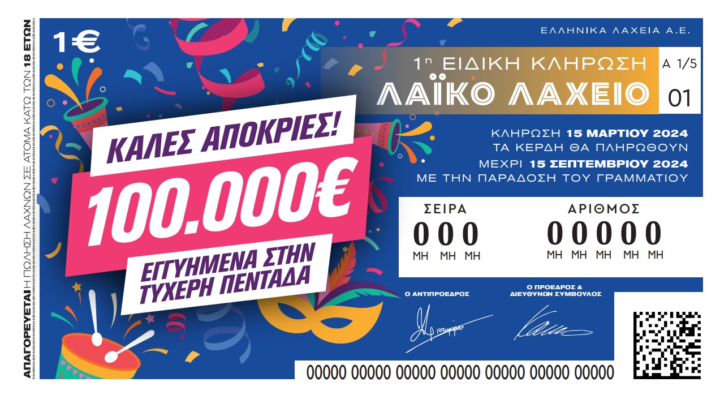 Στον ρυθμό του Καρναβαλιού κινείται το Λαϊκό Λαχείο, με την ειδική αποκριάτικη κλήρωση αύριο, 15 Μαρτίου, να μοιράζει εγγυημένα 100.000 ευρώ στην τυχερή πεντάδα.