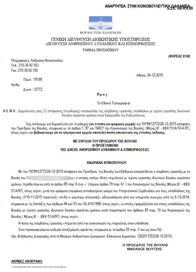 “Με την 19199/12772/24-12-2015 απόφαση του Προέδρου της Βουλής των Ελλήνων καταγγέλλεται η σύμβαση εργασίας με τη Βουλή του…, ο οποίος κατέχει θέση επιμελητού με σχέση εργασίας ιδιωτικού δικαίου αορίστου χρόνου, προβλεπόμενη από το άρθρο 85 παρ. 6 περ. ε΄ (πρώην άρθρο 79 παρ. 6ε΄ ) του Κανονισμού της Βουλής (Μέρος Β΄ – ΦΕΚ 51/Α/97), όπως ισχύει, μετά την ομόφωνη σύμφωνη αιτιολογημένη γνώμη του Υπηρεσιακού Συμβουλίου για τους υπαλλήλους της